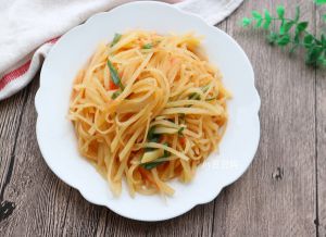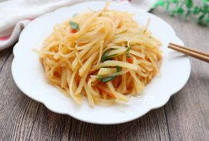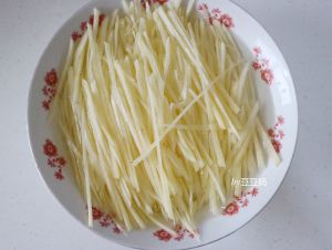 准备两个土豆,去皮后,切成细丝。切好后,用水清洗一下。
