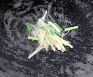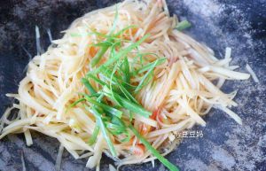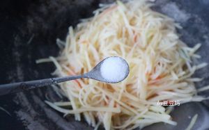 葱炒香,放入土豆丝,翻炒均匀,点一点白醋,翻炒,放少量糖。