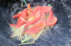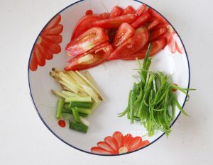 番茄切片,葱姜切丝,葱白和葱叶分开