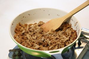 将摇好的肉丝用筷子打散,倒入平底锅小火翻炒