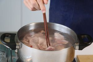 电压锅内放水(也可用高压锅或者普通锅),煮肉挡10分钟,拿出一捏就碎的程度。