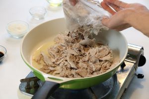 现在就可以炒肉松了(家里有面包机的可以用面包机烤),用不粘锅开小火慢炒,这个过程大概需要半小时左右,一点要小火,不停的用筷子翻炒哦!在炒的过程中可以根据口味适当加点白糖,如果太干,可以放入橄榄油或麻油。