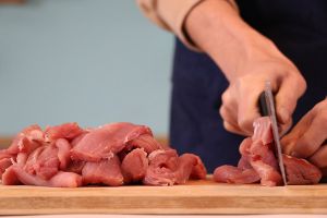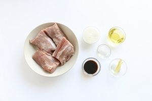 1.将瘦肉去掉肥肉和筋膜部分切成5*5cm大小待用