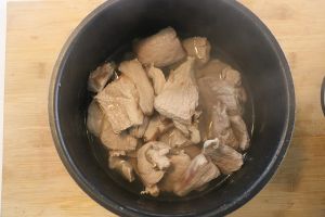高压锅炖的比较快,大约20分钟左右,如果用筷子轻轻一戳肉能散开就可以了。将肉丁捞出来晾干水分。