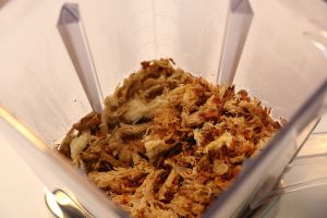 将煮好的肉放入果语原汁机(去头)摇出肉丝