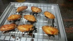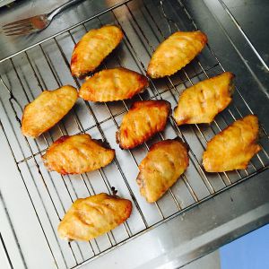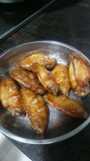 鸡翅放烤箱烤,一共烤25分钟,十分钟时取出用刷子两面刷上汁水,十分钟后同样取出刷上汁水,再烤五分钟即可