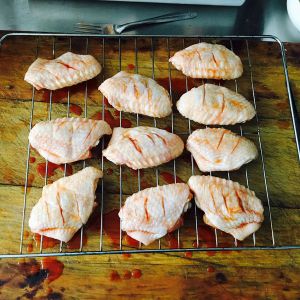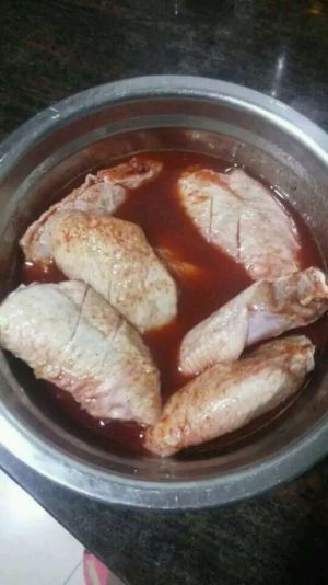 用化开的新奥尔良液浸泡鸡翅,使其入味,中途将鸡翅两面翻