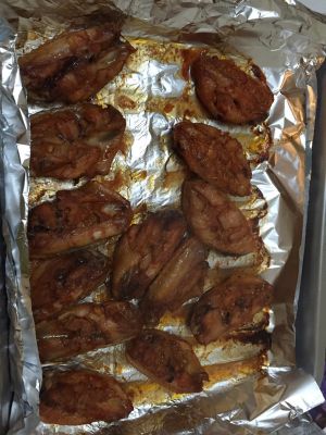腌制一到两小时,倒掉腌出来的水,放入烤箱(根据自己家烤箱的性格调时间和温度,我是直接开最大,然后时不时去翻个面,表面烤微焦味道更好)