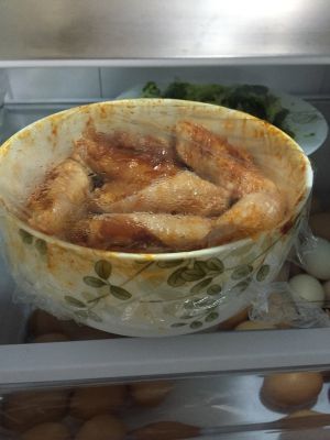 把鸡翅浸泡在调料中,用保鲜膜包好放置冰箱8~12小时(这样鸡翅才够入味)