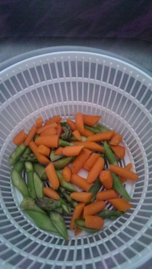 在锅里放水,煮沸,放入芦笋和胡萝卜,差不多两分钟后可以把芦笋和胡萝卜拿出
