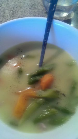 倒回锅中,加入牛奶(最好是买来可以生喝的那种)快要煮开的时候关火,加入盐、胡椒调味,最后撒欧芹