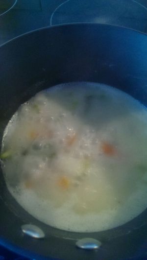 倒入锅中煮沸十分钟左右关火加入牛奶搅拌均匀,牛奶不要加热时间长,会造成营养成分流失,撒上黑胡椒粉,盐,糖调味即可