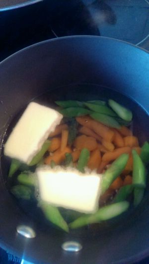 再在锅里放水和差不多熟的芦笋,胡萝卜,以及放两片黄油,焖锅