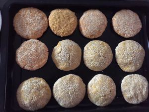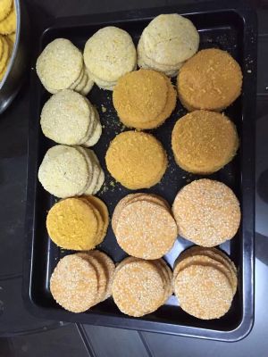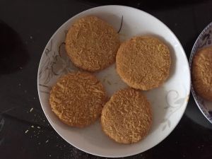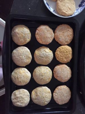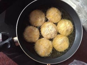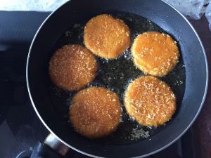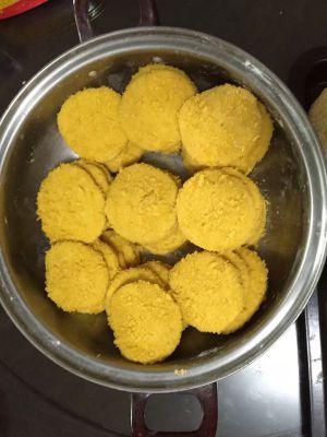 然后将番薯面团捏成饼状,拿到面包糠里滚一滚