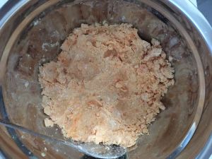 将番薯和南瓜蒸熟,分别加入糯米粉、生粉和白糖搅拌成面糊(图中是番薯的)