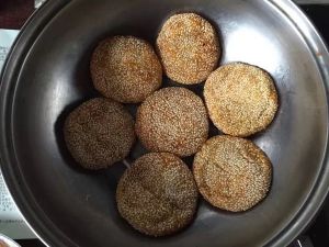 也是分别就南瓜饼和番薯饼捏成后放入芝麻里打个滚就行了