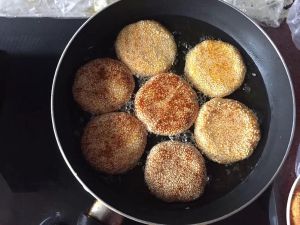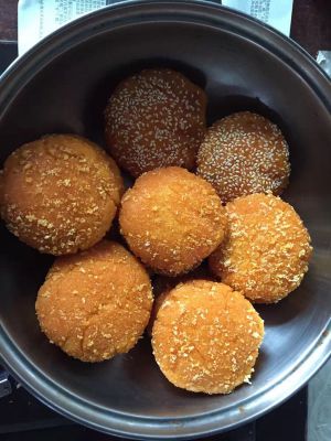 一小块面团压扁放入适量豆沙,跟包包子一样收口,搓圆放在芝麻上压扁(注意不要沾太多芝麻,不然后面煎炸很容易糊)