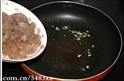 热锅上油,油热后放入姜末爆香,倒入腌好的虾仁。