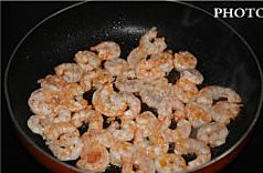 倒入锅内,加入适量盐大火快炒五分钟后,虾仁卷曲成球,肉成白色,肉膜泛红,即可出锅备用