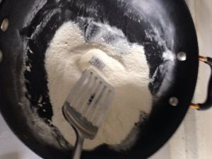 将糯米粉放入锅中炒熟,至面粉微黄,装入盘子待用