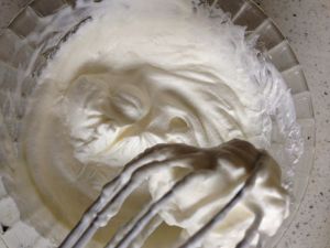 在蒸面糊的同时打发奶油,在淡奶油中加入适量细砂糖(具体的量以个人口味加入),奶油打至可以拉出三角不会塌