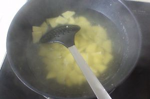 锅里多倒些油,油热后把土豆倒进去炸至金黄捞出备用。