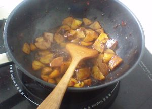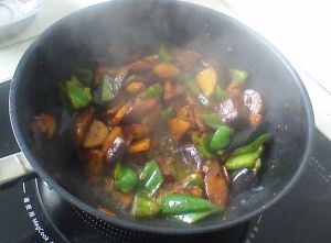 锅里少放油,油热放肉片、胡萝卜、青椒、姜翻炒一下,在放入茄子与土豆,再倒入提前挑好的酱汁。