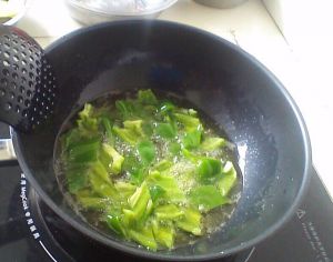 锅留底油倒入葱姜蒜炒香,再把青椒倒进去炒断生。