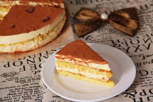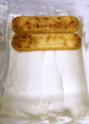 用40ml开水将1/2大勺意大利浓缩咖啡粉冲开,晾凉后加入20ml朗姆酒。手指饼干快速沾满咖啡酒铺在容器底部。