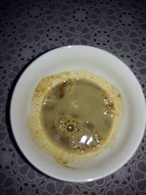 取1包速溶咖啡,加入30克开水冲泡,加入一小勺朗姆酒。