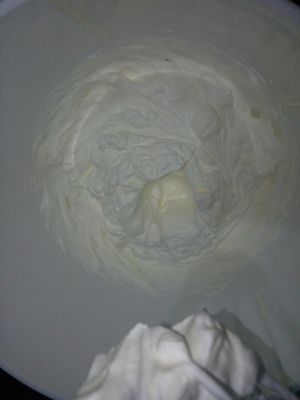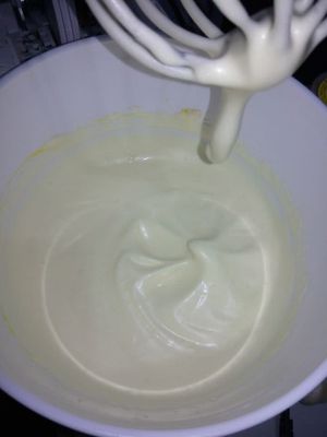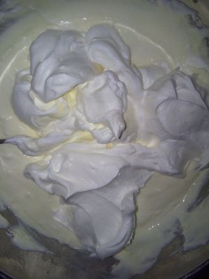 把马斯卡彭奶酪打至顺滑,加入已经晾凉的蛋黄糊中拌匀。