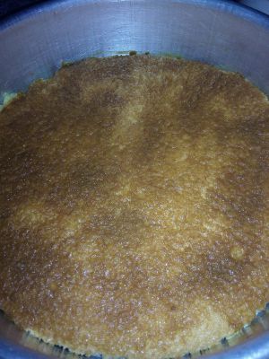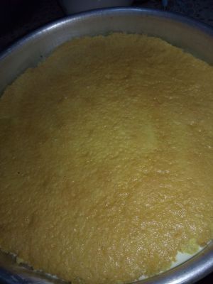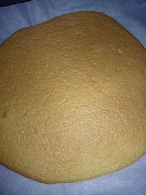 烤至深黄色取出油纸,把蛋糕胚从油纸上取下,倒入剩余的蛋糊继续烘焙另一个。取油纸时可以把蛋糕反扣在案板上,从一侧掀起油纸,反折过来轻轻向下撕。