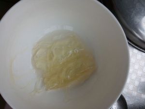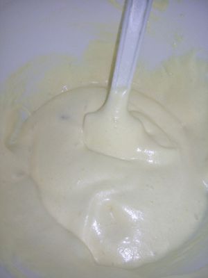 蛋清液分三次加入蛋黄液中,从底部翻拌,不要消泡