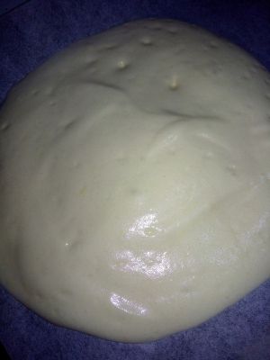 把75g糖放入75ml水中煮开,把刚煮开的糖水马上倒入打发的蛋黄中。(倒的速度要慢,要一直用电动打蛋器搅打蛋黄糊)