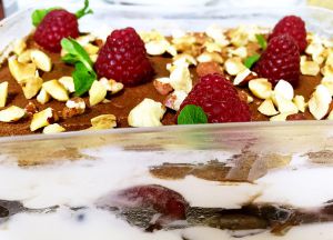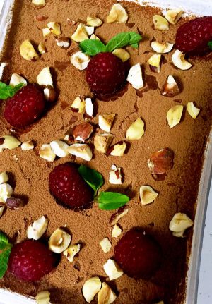 在果肉上再厚厚地涂抹一层乳酪。用面筛均匀筛上可可粉,码好树莓、撒榛子仁儿,装饰新鲜薄荷叶后,放入冰箱冷藏4-6小时。如果有条件的话,包括筛可可粉在内的所有最后步骤,可在冰箱冷藏后与亲友们分享前再完成哦,那样的提拉米苏会格外新鲜诱人呢!