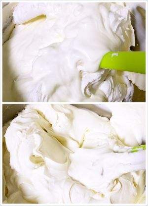 取三分之一打发的奶油,与奶油奶酪混合,搅拌均匀后再倒入剩余的三分之二,继续搅拌至均匀。