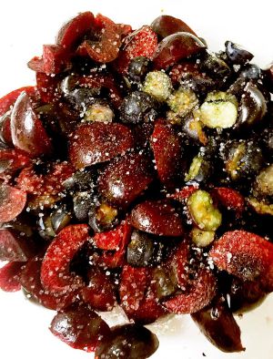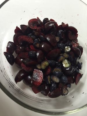 黑樱桃去核切成小块儿,蓝莓对半切开。