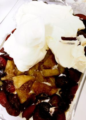 码好后在手指饼上再铺一层乳酪,随后将糖渍黑樱桃和蓝莓铺在容器中围边儿,中间铺上淋干的无花果肉。