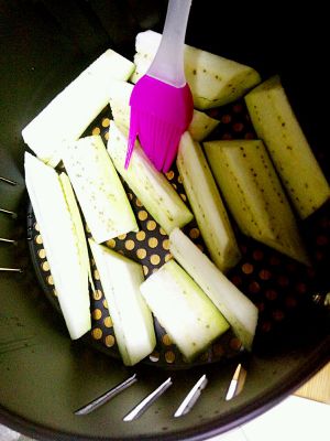 茄子,洗好之后切成小块均匀的放在篮子里。一勺油,放在碗里,用硅胶刷或者别的什么刷子,均匀的刷一下,这样口感会比较好,加热也快