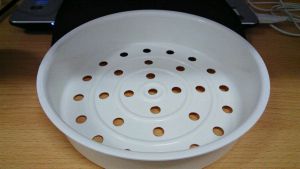 南瓜切皮,随意切成小块,更快熟透。用这类的盘,不会在碟里积多余的水。