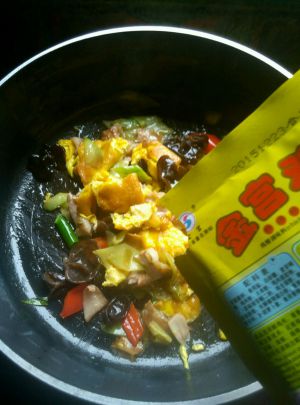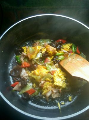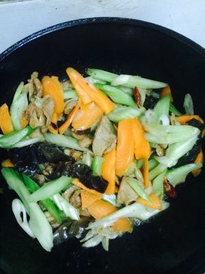 依次放入木耳,黄瓜,胡萝卜,肉面,鸡蛋翻炒。