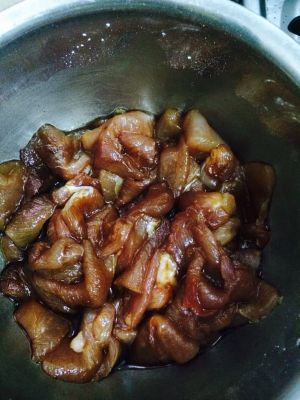 猪肉切片,放料酒、酱油、淀粉、清水抓匀。再加入适量油,抓一下。腌制20分钟。