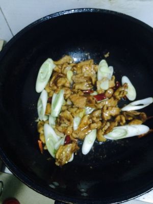 锅里放油!7成热时,放腌好的肉,小火搅拌致变色,放葱姜蒜辣椒,继续翻炒!