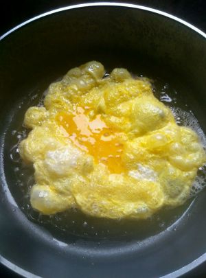 锅入油待油温高时倒入鸡蛋液成形后铲成小朵、铲入盘中。