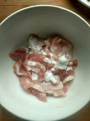 猪肉切簿片、放入料酒、豆粉、盐码味。