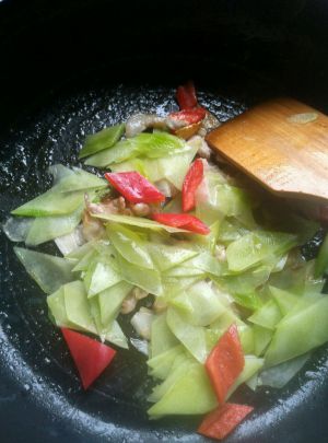 下入笋片红椒翻炒。