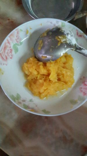 南瓜去皮切块,用高压锅放点水不用很多一点就可以了(不要没过南瓜),出锅前放糖调到适当的味道要甜(等下和面太淡不好吃)再用大勺子把南瓜块捣成泥