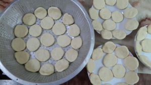 往糯米粉倒入南瓜液(越弄越好),和成面团不要太软,捏成一个个圆形后用两手微微压扁成饼