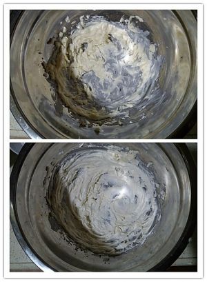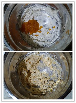 3.倒入60克南瓜泥(建议用黄心的南瓜~颜色会更好看),混合均匀。
