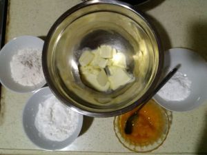 1.准备好所需材料。黄油室温软化。南瓜提前去皮去籽,切片蒸熟、趁热捣成泥。